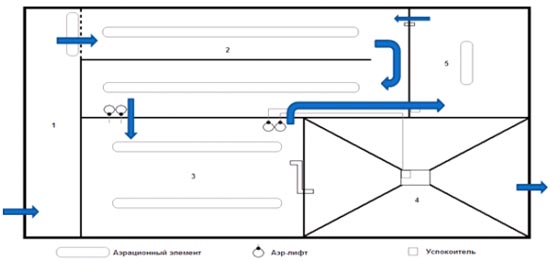 Таким образом, в процессе окисления происходит преобразование загрязнений в простые соединения (вода, минеральные соединения и газы), в результате из сточной воды удаляются органические загрязнения, проходят процессы денитрификации и увеличивается масса активной биологической пленки. Отработавшая и омертвевшая пленка оседает на дно и выносится в иловый отстойник. Необходимый для биохимического процесса кислород поступает постоянно с воздухом.